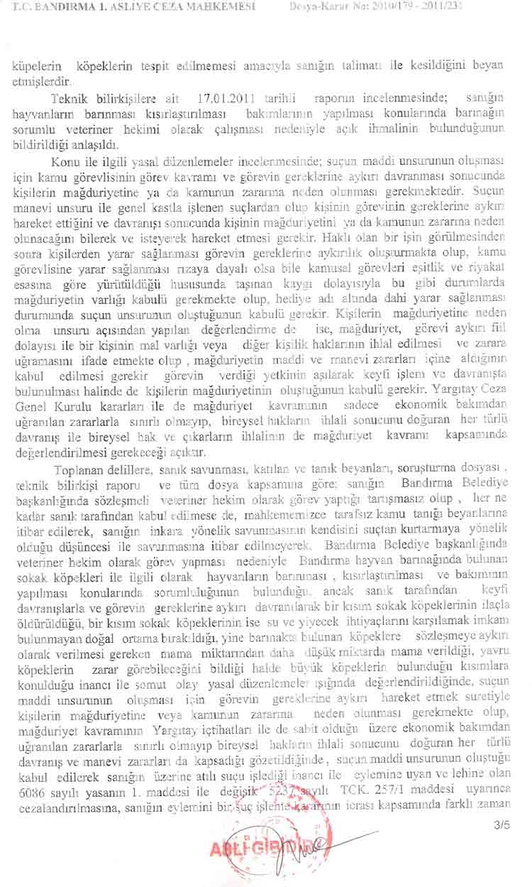 Bandırma 1. Asliye Ceza Mahkemesi, bakmak ve rehabilite etmekle sorumlu olduğu sokak köpeklerinden 12’sini boş arazilere ve dağlara bırakarak ölüme terk ettiği iddia edilen Cem Karabıyık hakkında, TCK’nın 257-1 Maddesi gereğince ’görevi kötüye kullanmak’’ suçundan 6 ay 15 gün hapis kararı verdi.