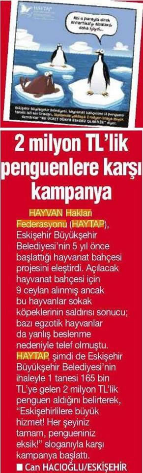 Eskişehir Büyükşehir Belediyesi tarafından yapılan hayvanat bahçesini protesto eden Hayvan Hakları Federasyonu (HAYTAP) üyeleri kendilerini demir kafes içerisine kilitledi. HAYTAP Başkanı Ahmet Kemal Şenpolat, Önce hayvanat hapishanesi kuruyor, sonra da buraya tanesi 165 bin liradan 10 penguen siparişi veriyor. Dile kolay toplamda yaklaşık 2 milyon lira diyerek belediyenin tavrına tepki gösterdi.