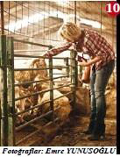 2- “Burası sakatat kısmı” diyorlar. Üç kadın, bant sistemiyle, bir bütün halinde önlerine gelen kesilmiş koyunların, iç organlarını çıkartıyorlar. Ellerini daldırıyorlar, hayvanın midesini, işkembesini, bağırsaklarını alıyorlar. Metal tepsilere koyuyorlar. Hani suşicilerde önünüzden akıp giden bir bant vardır ya, burada da onun bir değişiği dönerken, kadın işçiler üzerlerindeki tepsilere sakatatları yerleştiriyorlar. Yine kötü hissetmiyorum kendimi.Yürüyoruz...3- Biraz daha sarsıcı bir görüntüyle karşılaşıyorum. Tepeden sarkan koyunlara hava verip şişiriyorlar ki, derisi daha kolay yüzülsün.