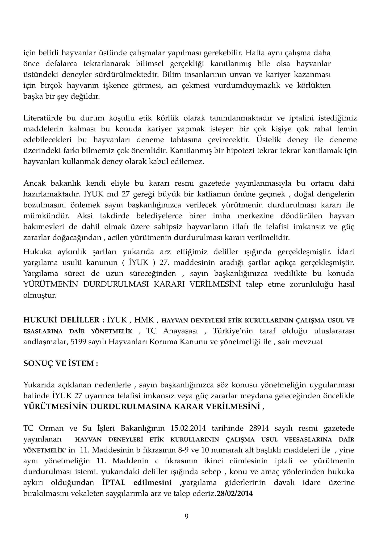 Hayvan deneylerinin özellikle başıboş sokak hayvanları üzerinde uygulanmasına ilişkin dava yönetmelik çıktıktan onbeşgün içinde (2014 yılında ) hemen tarafımızca açılmıştır. Merak edenler için dava dilekçesi ve gerekçeleri aşağıdadır.